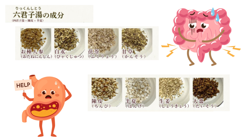 前半4つ(人参・白朮・茯苓・甘草)は、胃腸を支える基本処方「四君子湯」の組み合わせ。そこに、痰や胃もたれを解消する「半夏・陳皮」と、気を巡らせて消化を助ける「大棗・生姜」が加わることで、六君子湯になります。